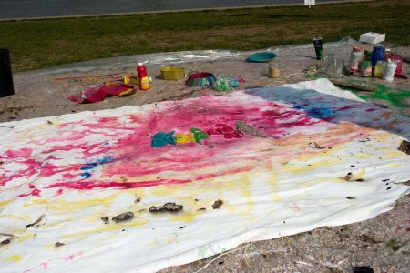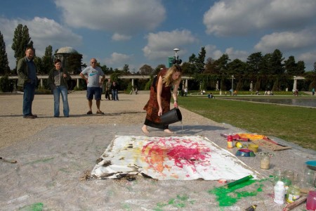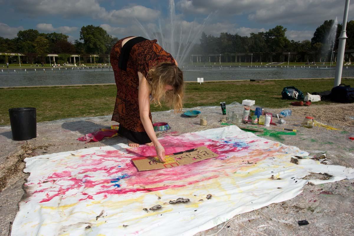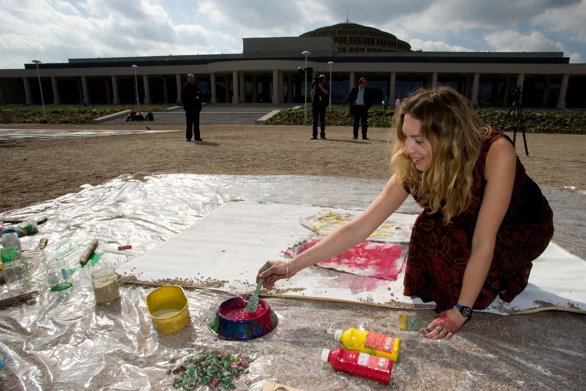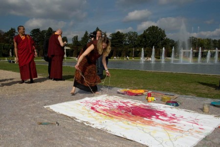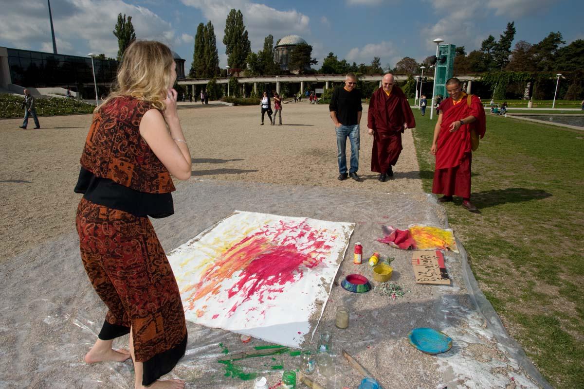 Painting action during meeting with 14-th Dalai Lama, Hala Stulecia, Wroclaw ; photo by Marcin Gulis